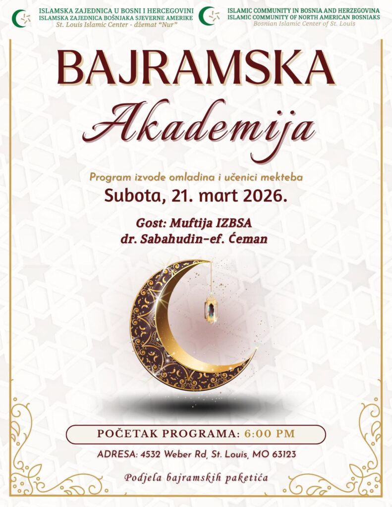 Ako postoji večer koju trebamo unaprijed upisati u kalendar, onda je to bajramska akademija u subotu, 21. marta. To je večer u kojoj bajram nećemo samo obilježiti, nego ga zajedno i doživjeti.