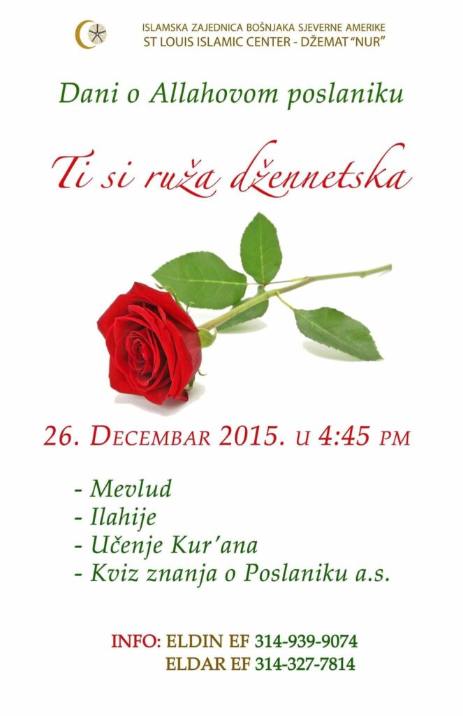 U subotu 26. decembra u prostorijama džemata “Nur” u St Louisu je održana mevludska svečanost pod nazivom “Ti si ruža dženetska”. Okupljene džematlije sui mali priliku da uživaju koji je uključivao izvodjenje mevluda od strane Eldin ef Suše, Eldar ef Malkića i Omera Mustafića. Nakon toga, sve prisutne su mladi polaznici mekteba jednostavno oduševili svojim […]