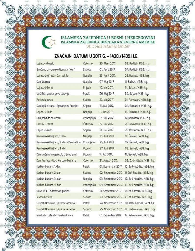 Predstavljamo vam detaljnija objašnjenja za neke mubarek dane i noći koji se nalaze u takvimu (kalendaru) Islamske Zajednice u Bosni i Hercegovini, kao i neke znaćajnije dane koji nisu u takvimu, ali su veoma bitni za našu zajednicu u St. Louisu, ali i Sjevernoj Americi. PDF sa svim datumima možete naći na ovom linku ili u […]