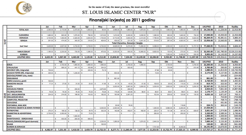 St. Louis – U produžetku možete naći finansijski izvještaj za 2011 godinu, uz sva potrebna objašnjenja. Ukoliko imate dodatnih pitanja u vezi finansijskog izvještaja može te nam se obratiti putem emaila, telefona ili lično u džematu.