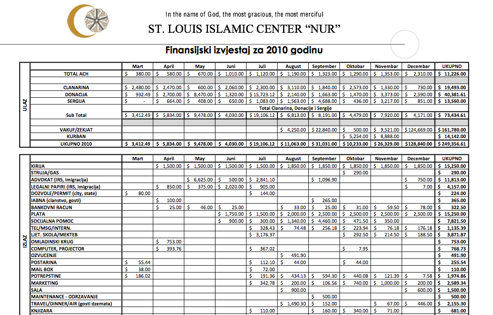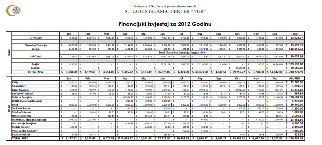 St. Louis – U produžetku možete naći finansijski izvještaj za 2012 godinu, uz sva potrebna objašnjenja. Ukoliko imate dodatnih pitanja u vezi finansijskog izvještaja može te nam se obratiti putem emaila, telefona ili lično u džematu.