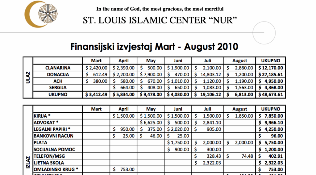 St. Louis- Finansijski izvještaj džemata Nur za prve mjesece rada džemata. Večinu troškova sačinjavaju administrativni troškovi pokretanja džemata te inicijalni troškovi dovođenja i regulisanja legalnog statusa imama. PREUZMI 2010-Mart-August-Fin-Izvjestaj