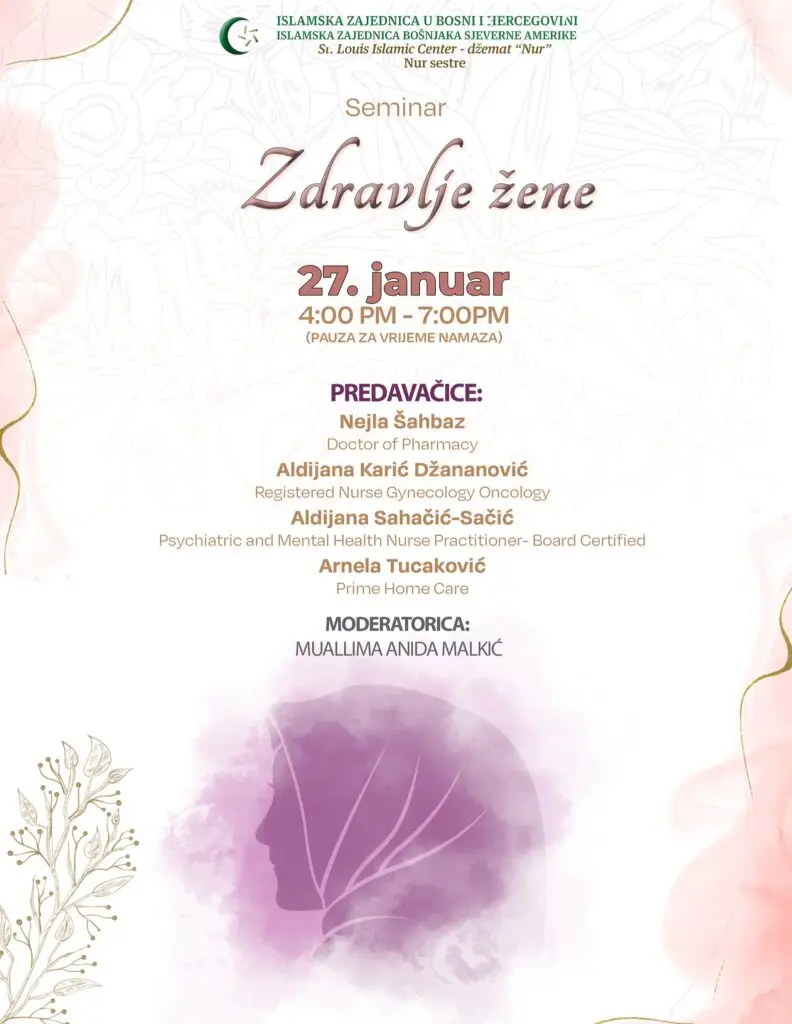 U organizaciji ženske grupe džemata “Nur Sestre”, pozivaju se sve hanume na edukativni seminar pod nazivom “Zdravlje žene”. Seminar će se održati 27. januara, sa početkom u 4 popodne i trajanjem do 7 navečer, uz pauzu za vrijeme namaza. Ovo je izuzetna prilika da se naše džematlijke upoznaju s važnim informacijama koje se tiču ženskog […]